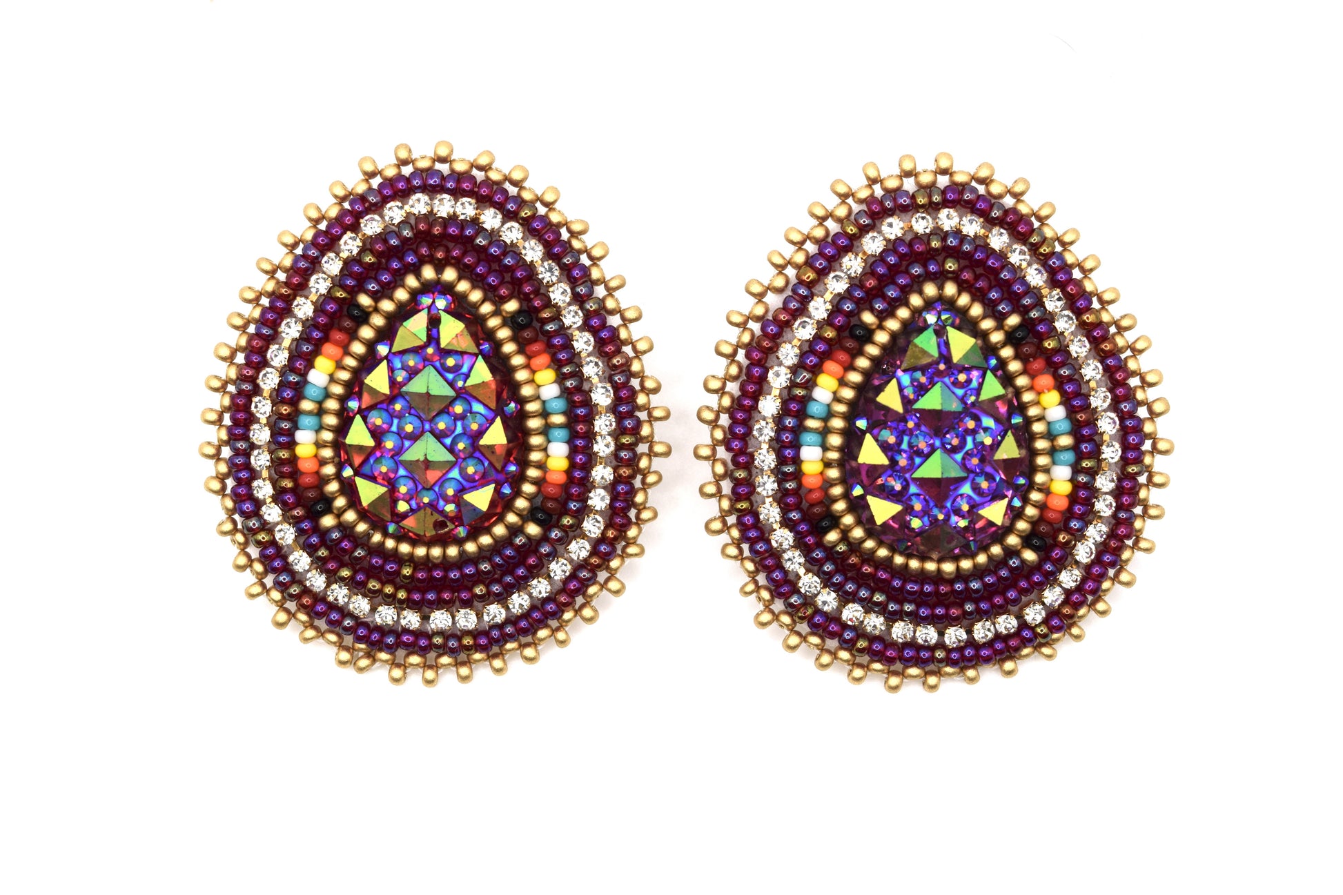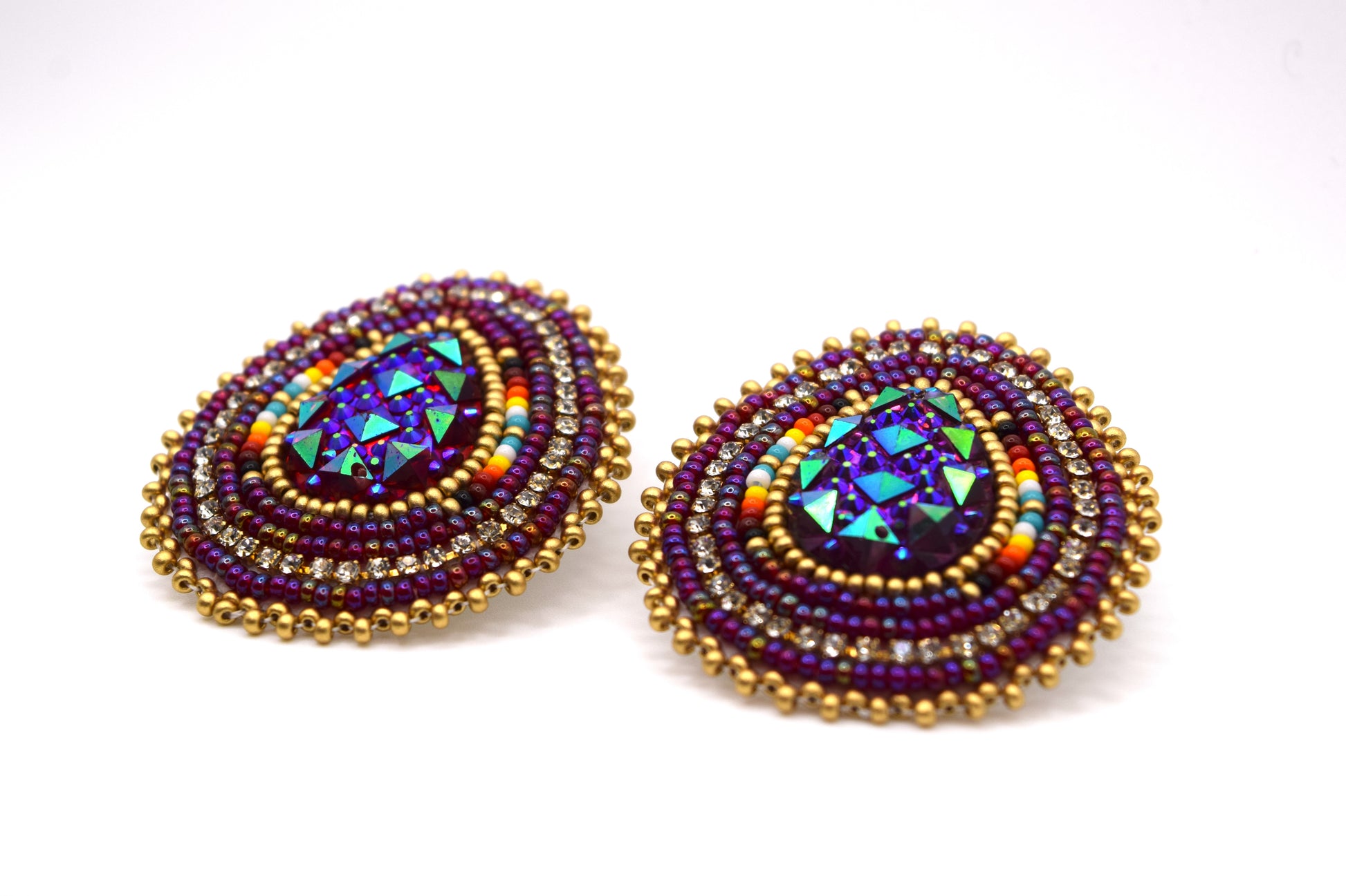 Boucles d'oreilles perlées sur feutrine, crochet "fingernail", dimension 2 pouces de diamètre.