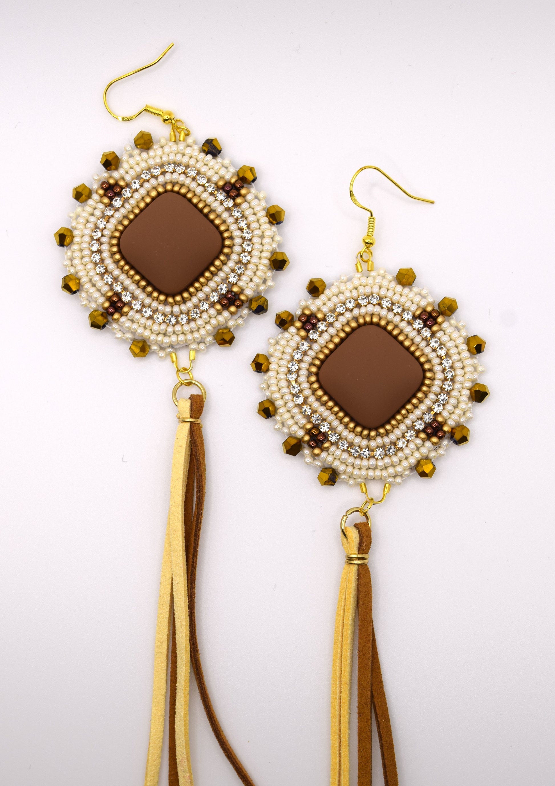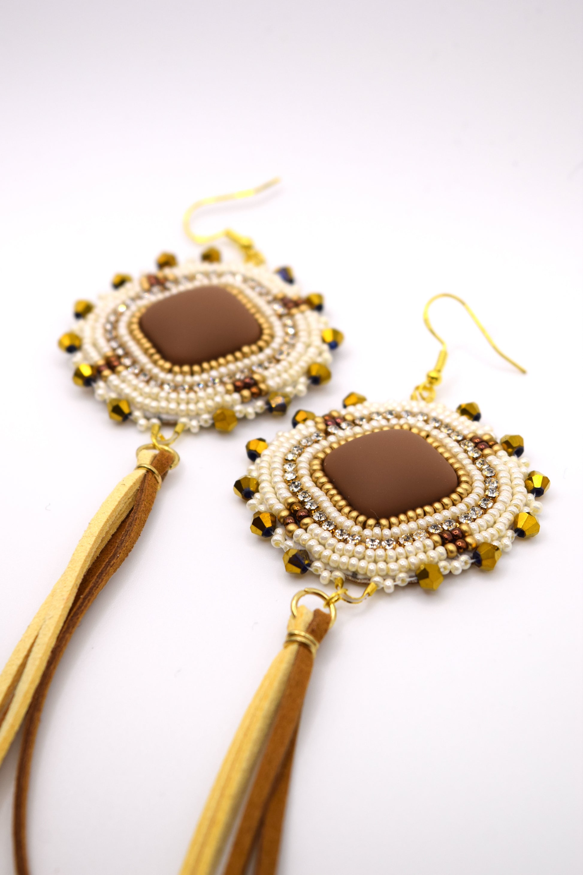 Boucles d'oreilles sur feutrine, décorées de cordons de suède. Environ 9 pouces de longueur