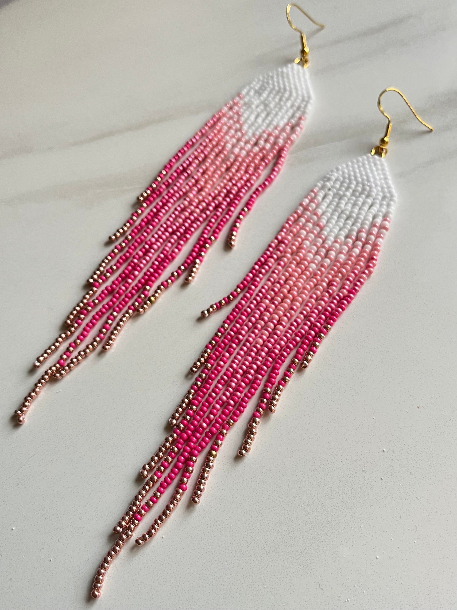 Boucles d'oreilles perlées à franges. Dimension : 6 pouces de longueur.