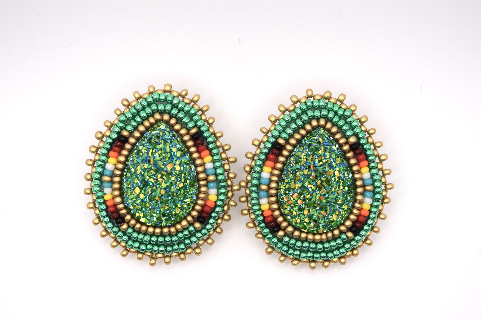 Boucles d'oreilles perlées sur feutrine. Environ 1 pouces de largeur et 1,5 pouces de longueur.