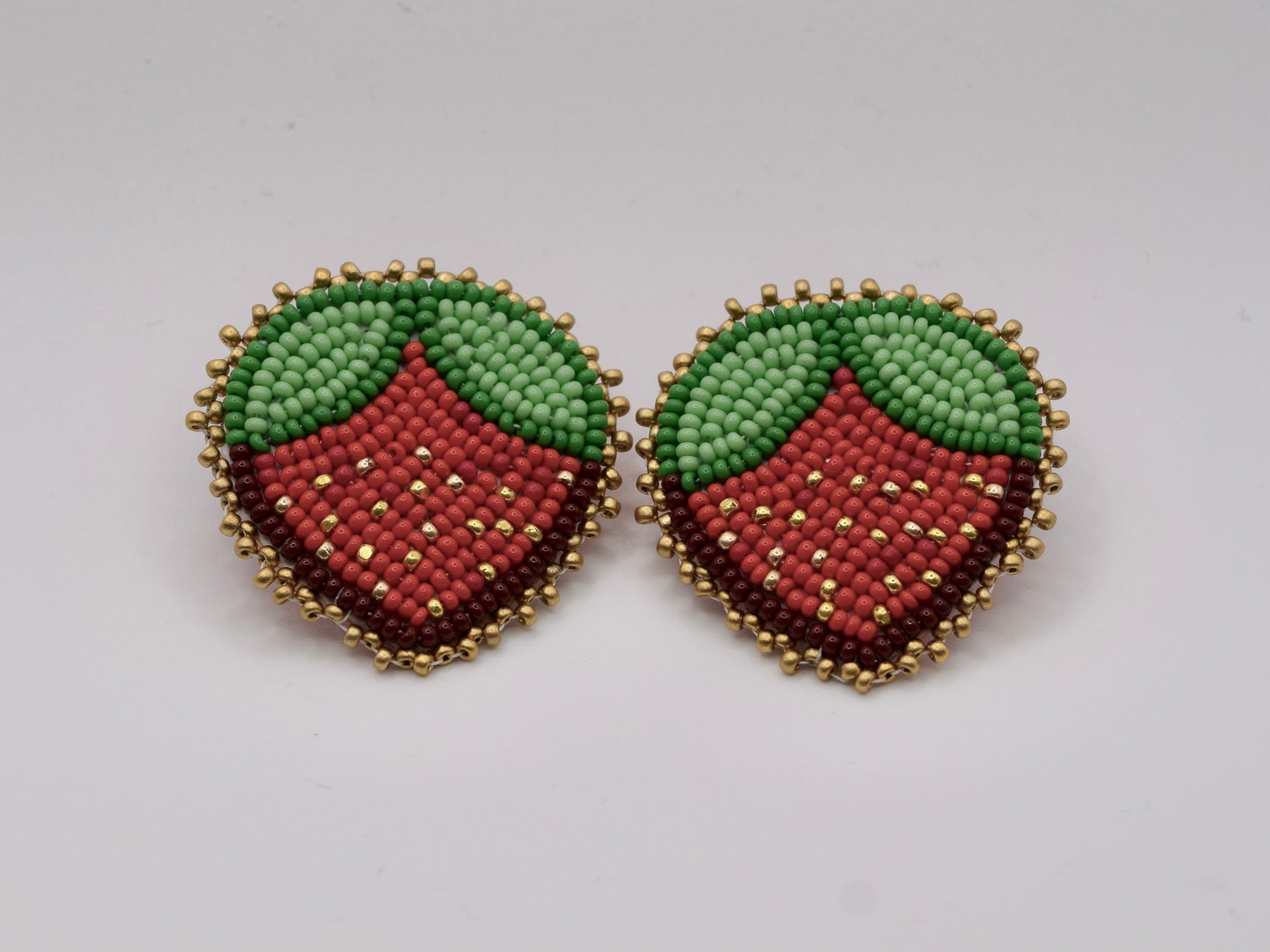 Des petites boucles d'oreilles pelées sur feutrine en forme de fraises.