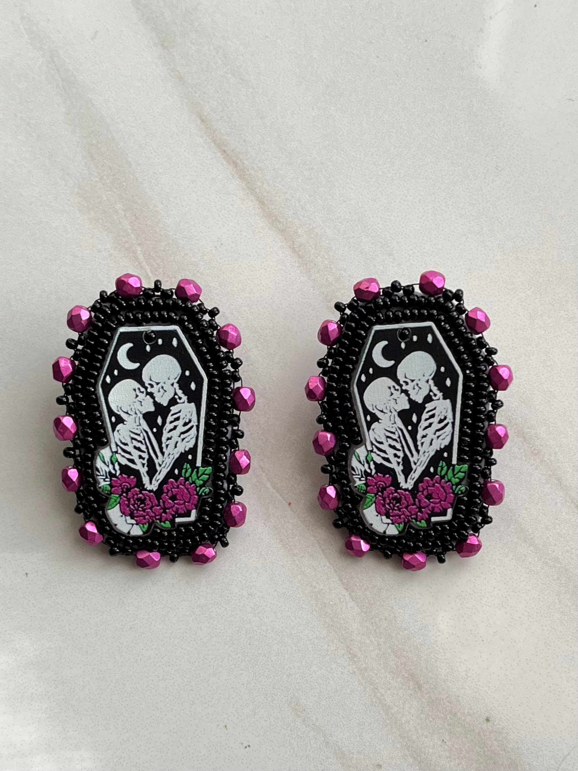 Boucles d'oreilles perlées sur feutrine. Dimension : 2 pouces de hauteur, 1 pouce de largeur.